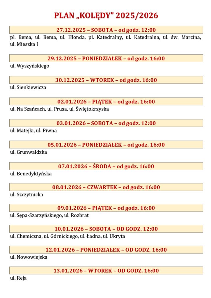 Każdego dnia przewidziane są konkretne ulice, dzięki czemu można wcześniej przygotować się na wizytę kapłana. Plan obejmuje zarówno końcówkę grudnia, jak i pierwsze tygodnie stycznia, co daje możliwość spokojnego i owocnego przeżycia tego czasu po świętach Bożego Narodzenia.