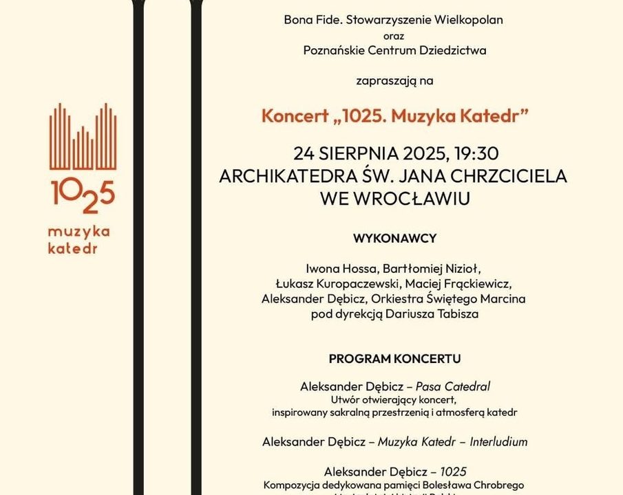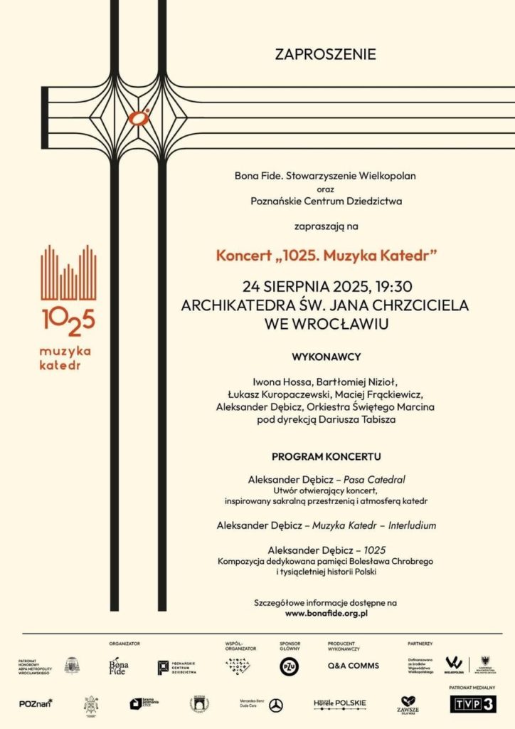 Koncert „1025. Muzyka Katedr” odbędzie się 24 sierpnia 2025 roku o godzinie 19:30 w Archikatedrze św. Jana Chrzciciela we Wrocławiu. Wystąpią m.in. Iwona Hossa, Bartłomiej Nizioł, Łukasz Kuropaczewski, Maciej Frąckiewicz, […]